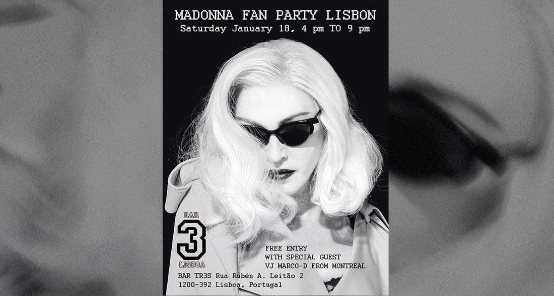 Madonna fan party with special guest VJ Marco-D from Montreal! Come have a drink and watch some Madonna video projections before her Saturday night show in Lisbon. Classic videos, live videos and special video mixes! Bar TR3ES is only a 20 min walk away from Madonna's show! One, two, cha-cha-cha!!